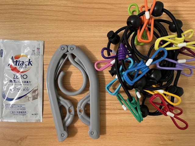 洗濯ばさみのストッパーが優秀。コンパクトにまとまるし、大して重くないのでどこに行くにも必ずスーツケースに入れておきます。