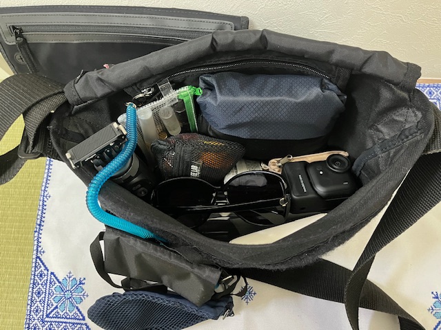 → カメラ+水筒+財布が入る中型サイズ。肩紐太めだと、長時間でも肩がラクです。