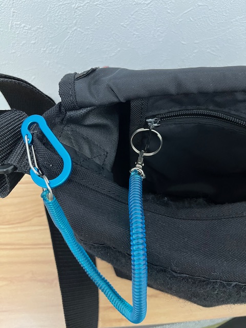 開閉部分をお腹側にしたらスリも手を入れる余地ゼロ。カラビナでロックしなくても安心。