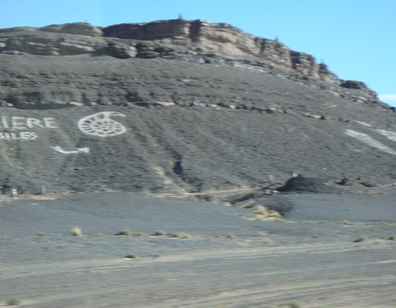モロッコ旅行で多くの人が訪れるサハラ砂漠。その道中、山の中腹にアンモナイトの絵や矢印が描かれた場所を見かけます。